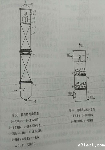 湍球塔和填料塔在设计上没有根本的区别,其填料是空心或实心小球,在高的操作气速推动下,小球高速湍动而成流化状态。液体由塔顶喷下润湿小球表面而与气相密切接触且高强度更新,增强了两相的接触传质,提高了吸收效率。湍球塔特别适用于处理含尘气体。其结构如图所示。